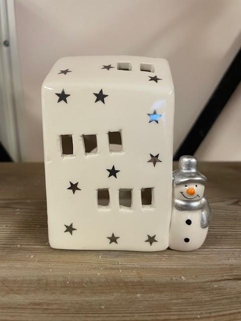 Hus til telys m/snømann- hvit/sølv -11cm