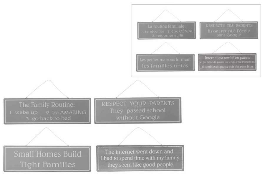 PLACARD MIX 1 ENGLISH/FRENCH METAL ANTIQUE GREY/WHITE ASSORTMENT OF 4
